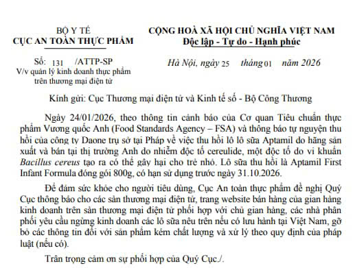 Ngày 25/1/2026, Cục An toàn thực phẩm đã ban hành Công văn 131/ATTP-SP năm 2026 [...]